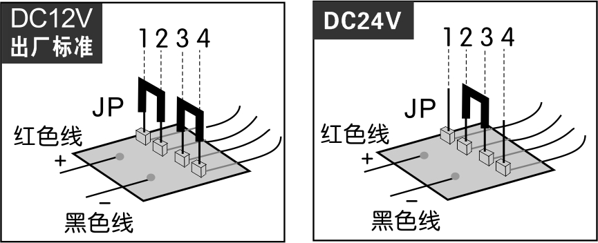 4、電磁門吸出廠時的標準:工作電壓為DC12V 。如需使用在DC24V的系統(tǒng)中,請用跳線帽連接JP的第2腳與第3腳(如下圖調節(jié)方法)。