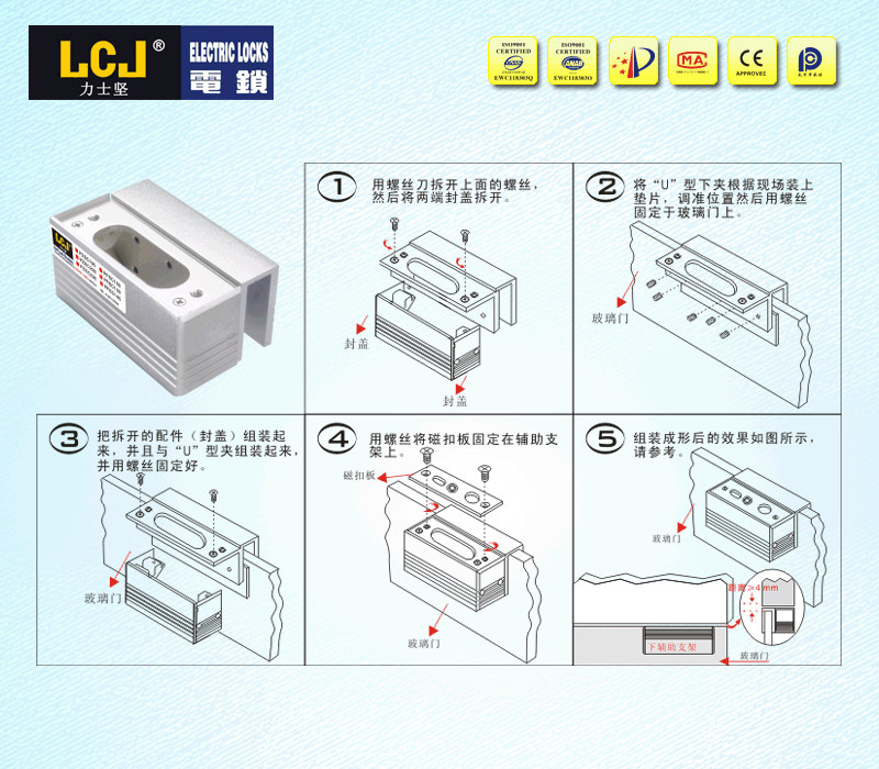 配合電插鎖EC235系列、EC235H磁扣板,應(yīng)用于8~12mm厚無框玻璃門(15mm玻璃特定) |